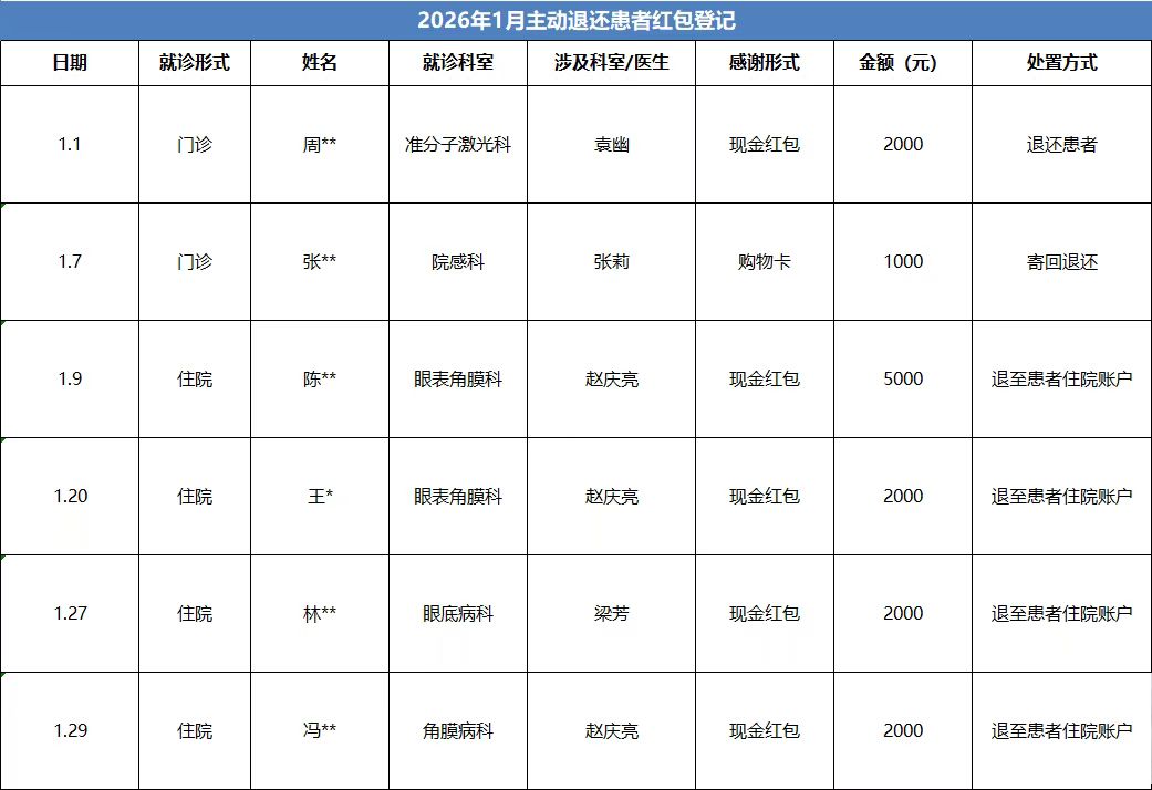 2026年1月主动退还患者红包登记