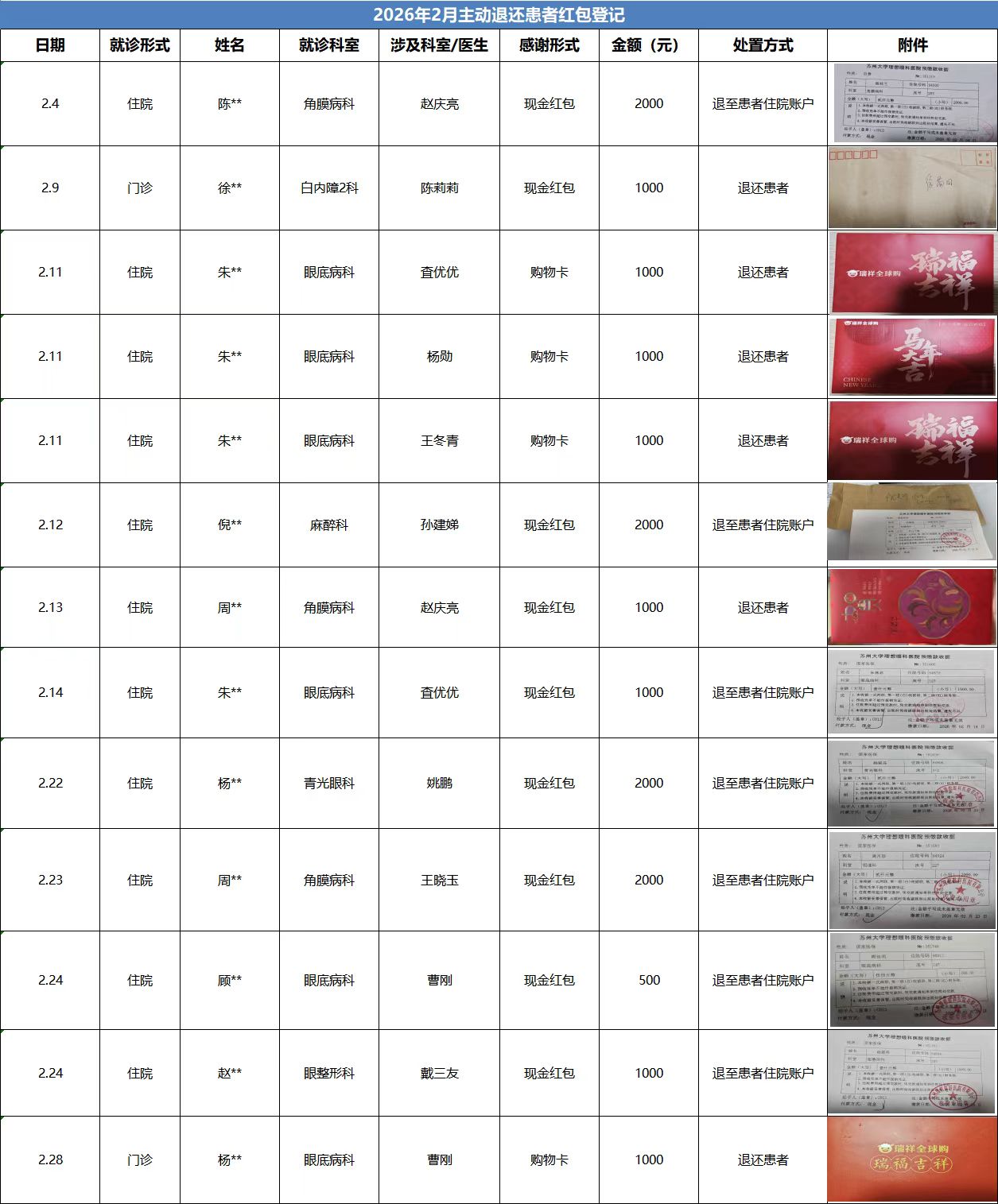 2026年2月主动退还患者红包登记