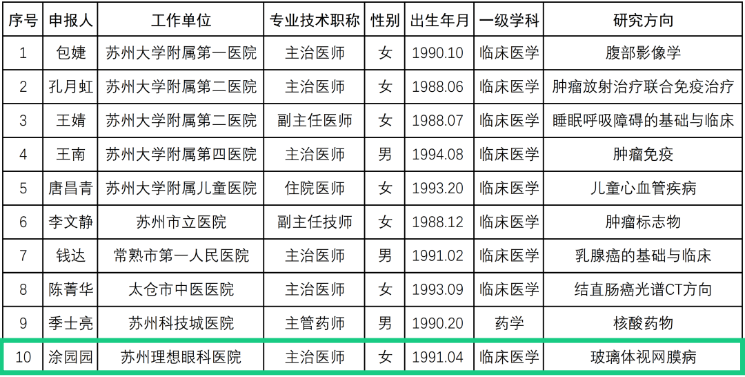 近日,苏州市医学会公布2025年度“姑苏医星”青年科技人才托举工程资助名单,我院玻璃体视网膜病研究领域青年骨干医师涂园园成功入选,成为本年度全市入选的10名青年医师之一。这既是对其个人专业能力与科研潜力的高度认可,也是我院在青年人才培养与医学科研创新领域的重要成果体现。