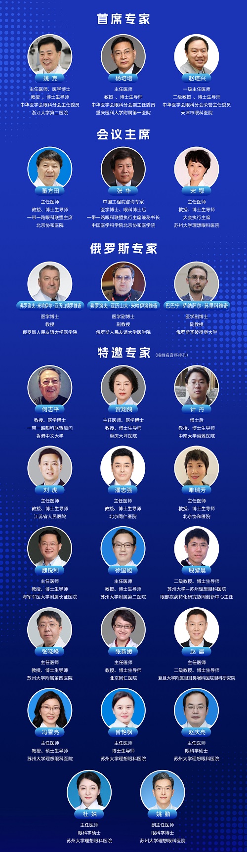 嘉宾阵容。本次会议汇聚中俄两国眼科领域的学术中坚力量,既有深耕临床与科研多年的中外学科带头人,也有在细分领域下拥有丰富经验的临床骨干医师。嘉宾将围绕各自擅长领域,交流前沿研究进展。
