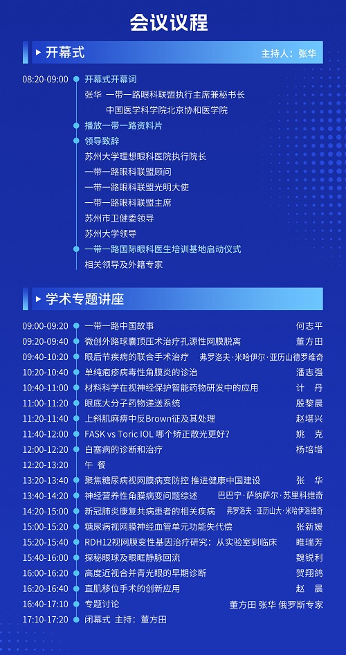 会议议程。中外学术大咖将以临床问题为导向,科研创新为引擎,聚焦近视手术、青光眼治疗、眼底病防治等关键方向,分享与实证案例,构建理论与实践的桥梁。