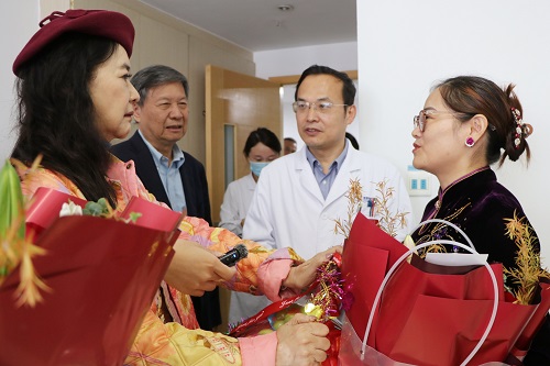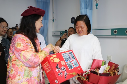 随后,胡慧中一行前往住院部探访由苏州看见吴中基金会提供帮助,医院角膜病科主任赵庆亮主刀的两位角膜移植术后患者。在病房内,她仔细询问患者恢复情况,与患者亲切握手、拍照、交流,聆听患者讲述治疗经历,鼓励他们保持乐观与感恩,称赞医护团队的精心照料,并为患者送上鲜花与苏州特产,现场氛围温馨感人。