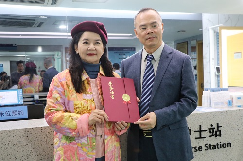 苏州大学理想眼科医院党支部书记、CEO黄俊伟介绍医院在“一带一路”眼科合作、公益项目开展方面的成果,并为胡慧中颁发光明大使纪念证书,感谢她以无私的爱心与关怀,亲临医院探访角膜移植患者,以纪念女生为传递光明与希望所做出的宝贵贡献。胡慧中表示,未来将持续支持眼科公益项目,让光明与希望惠及更多人。