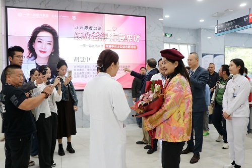 10月25日下午胡慧中抵达医院,于“光明同行,一路有我”主题电子墙前合影留念,正式开启公益行程。前期通过医院微信公众号评选出的8名幸运粉丝,与胡慧中近距离见面。