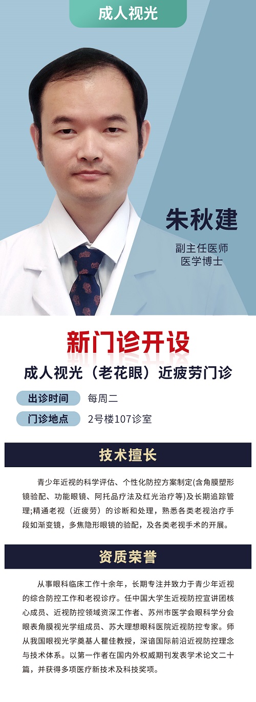 即日起,苏州大学理想眼科医院正式开设成人视光(老花眼)眼疲劳门诊,以满足成人患者的多层次个性化医疗需求,解决中老年人近视、远视、老视、眼疲劳等问题。朱秋健副主任医师每周二坐诊 2 号楼 107 诊室,可提供视力评估、框架镜、多焦点镜片、角膜接触镜、屈光手术等矫正方案