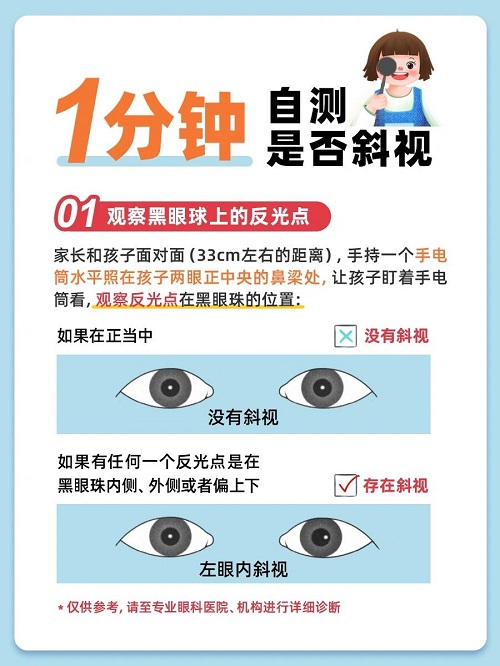 明显的斜视外观上很容易看出来。比如看起来像‘斗鸡眼’,眼睛朝里偏斜,这叫内斜;或者孩子看起来总像在发呆、走神,这常见于外斜视。