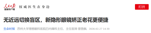 近日,人民日报官方平台转发了苏州大学理想眼科医院白内障科曾艳枫主任的非手术性老视矫正专业文章,引发广泛关注。此次转发不仅体现了对老视(老花)人群健康需求的高度重视,更彰显了曾艳枫主任在老视矫正领域的专业水平,以及苏州大学理想眼科医院的诊疗实力。