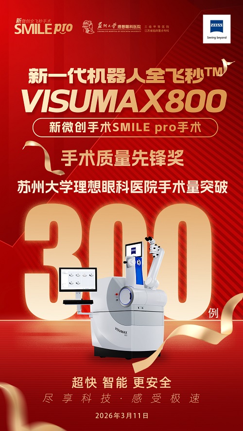 近日,苏州大学理想眼科医院SMILE pro新微创全飞秒手术量成功突破300例!这一数字是患者对医院屈光技术的高度认可,更是医院在近视矫正领域深耕细作、技术迭代的有力见证,彰显了其在苏南地区屈光矫正领域的领先实力。