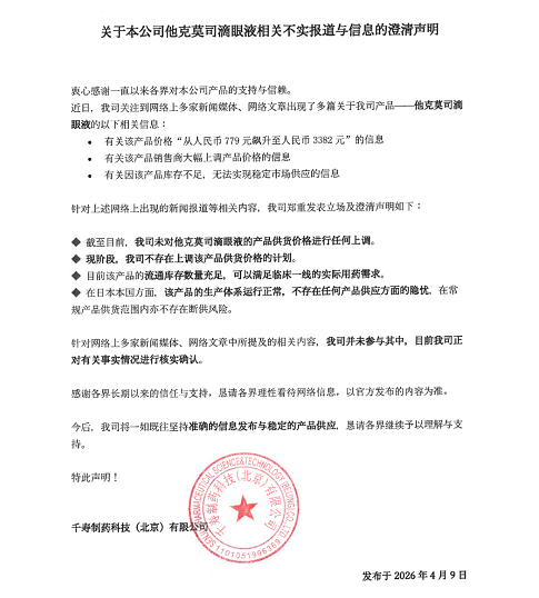 面对舆论关切,4月9日晚间,该药品境内责任人千寿制药科技(北京)有限公司发布官方澄清公告。公告明确表示:截至目前,公司未对他克莫司滴眼液的产品供货价格进行任何上调,现阶段也无调价计划;目前产品流通库存充足,可满足临床一线用药需求;进口渠道稳定,不存在供应短缺风险。